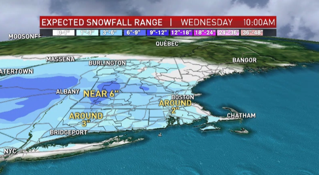 Isolated additional snow accumulation is possible in those snow bands. The main event Tuesday night into Wednesday morning brings us a widespread 1-3 inches of snow across the northeast, 1-2 inches at the coast, around 2 inches in Boston, around 3 inches in Worcester, 4-6 inches in the Green mountains and Berkshires and around 4 inches in southern New Hampshire.